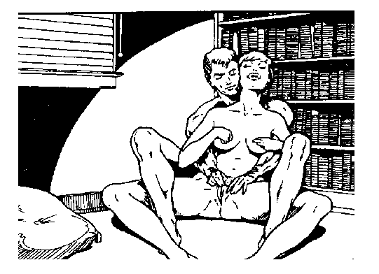 Подпись под рисунком: «Белоснежка и Принц отрабатывают некоторые приемы, описанные в этой главе, пока гномы работают в лесу». Рисунок относится к разделу «Учиться массировать женские гениталии» маленьким маятником или о часах с кукушкой, если можете. Есть шесть или семь часов, или временных тазовых зон, с которыми следует считаться при массаже женских гениталий. Самый эффективный способ обследования женских наружных половых органов и влагалища заключается в том, чтобы представить себе их в виде циферблата часов. Отработка па То, о чем здесь написано, может занять день или год. Не ленитесь скрупулезно, почти подобострастно следовать указаниям. Если ваш палец находится на том месте, где стрелка «часов» указывала бы на один час, и она внезапно застонала, а все тело судорожно извивается от удовольствия, то отметьте для себя это место. Если вы в течение недели или большего времени так и останетесь на этой отметке, так не дойдя до двух часов, то кому до этого какое дело? Имейте в виду, что те точки, которые доставляют небольшое удовольствие, так же важны, как и те, от которых вспыхивает фейерверк.