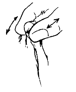Мужчины совершают большую ошибку, когда лишают свои пальцы чувства юмора. Кончики пальцев, которые дразнят и пританцовывают, встретят особенно теплый прием у женщины между ног. Например, мягкая пробежка кончиками пальцев вверх и вниз по бедрам женщины стоит целого состояния и куда более соблазнительна по сравнению с обычным засовыванием вашего среднего пальца в ее промежность. Когда она готова впустить ваши пальцы в себя, то она даст вам знать об этом в каких-то неопределенных выражениях, но даже и тогда не будет лишним немного помедлить, подразнить и поиграть еще немножко. Секс с участием пальцев является куда более эффективным, если кончики ваших пальцев более игривы и восприимчивы, нежели серьезны или энергичны. Джен для лагеря новобранцев — изучите ее стиль «Это не рыба или соленые орешки, не надо хватать за что попало и при этом надеяться на лучшее. Это очень тонкая материя. Даже самое незначительное движение может вызвать ответную реакцию, хорошую или плохую». Женщина, 45 лет Последняя часть этой главы посвящена особому виду игры с пальцами, к которой женщины никогда не прибегают во время мастурбации. Но, во-первых, это срабатывает, если вы способны научиться стимулировать ее так же, как это делает она сама. (А что, если она не занимается мастурбацией? Ну что ж, тогда вы можете осваивать это занятие вместе.) Со временем вы сможете дополнить к уже усвоенным знаниям ваши собственные трюки, но большой ошибкой будет прибегать к ним, не изучив основ этого дела — ее основ. Сначала проведите один или три месяца в лагере для новобранцев, изучая основы секса с использованием пальцев, где в качестве наставника будет выступать ваша возлюбленная, а вы сами в качестве связного. Поскольку вы имеете постоянную партнершу, то вы могли бы попросить ее нарисовать маленькие красные сердечки на полях этой главы в тех местах, которые могли бы оказаться для вас полезными. Это что-то вроде того, как некоторые рестораны проставляют красные флажки в своих меню напротив тех блюд, которые, как предполагается, убьют вас не так быстро, как другие. Вот несколько советов, которые могут оказаться полезными.