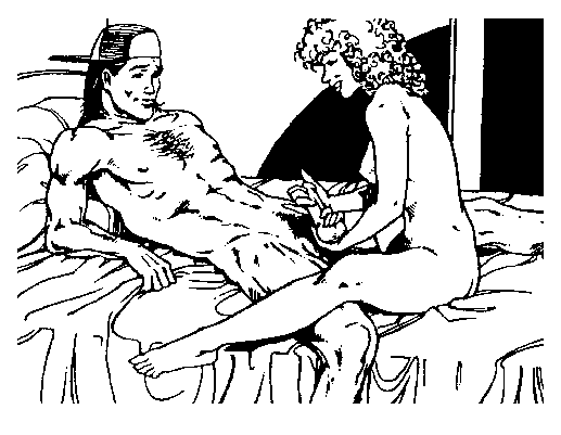 «Мужчина с невидимыми яичками». лобковой кости. На самом деле он опускается к яичкам и крепится внутри тазовой области. Некоторые мужчины получают удовольствие, когда им массируют «невидимые части» их гениталий. Засуньте руку в пространство между яичками и нежно потрите и промассируйте пальчиками гладкую поверхность, расположенную за ними. Массаж под яичками Если кожа яичек упругая, то нагрейте комнату и положите на яички теплую салфетку. Оставьте их в таком положении на несколько минут, чтобы мошонка согрелась, или до тех пор, пока яички не обмякнут. Для того чтобы убедиться в этом, нажмите на мошонку кончиками пальцев. Они должны прощупать ту часть пениса, которая находится под мошонкой. Массировать здесь следует движениями, направленными в сторону анального отверстия. В этой части пениса сходятся связки, мышечные ткани и нервные окончания. Нажатие свободной рукой на это место во время массажа основной части пениса приводит к тому, что весь стержень пениса от основания таза до самой головки испытывает нежные и, как думают мужчины, сладостные ощущения, от которых по всему телу разливается приятное тепло. Вы также можете массировать эту область во время орального секса. Эта часть пениса меньше десятицентовой монетки и вдобавок спрятана под яичками или находится в области, расположенной между яичками и анусом. Она может находиться на одной из сторон стержня пениса, а не обязательно в его центре. Что же касается наших яичек, которые преграждают путь к этой части пениса, то вам следует делать то же самое, что делаем и мы, мужчины: просуньте палец в пространство между яичками или же за них, можно также просто сдвинуть яички в сторону. Мужские яички — это очень нежная часть мужских гениталий, и любой пришедшийся на них удар, ушиб или резкий толчок может заставить мужчину согнуться пополам от невыносимой боли, но только не тогда, когда их партнерша ласкает или массирует их. Массирование этой области ощущается мужчинами так же замечательно, как хорошее растирание спины, с той только разницей, что эта область расположена между ног мужчины. Вместе с тем постарайтесь, чтобы в самом начале ваши движения были нежными, и помните, что одни мужчины испытывают от этого огромное удовольствие, а другие вообще не любят, когда кто-либо прикасается к этому месту. Массаж, который включает массирование яичек Далее приводится несколько приемов, которые можно опробовать во время стимуляции яичек, а также несколько видов движений, которые можно использовать для массирования как яичек, так и пениса. Все они не могут вызвать ощущение дискомфорта или стать причиной боли. Если такое вдруг случится, то сразу же остановитесь.