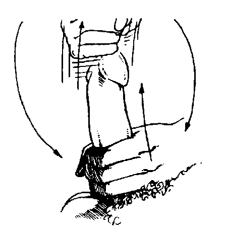 Когда будете стимулировать пенис руками или при оральном сексе, то не колеблясь прибегайте к поворотным движениям вверх и вниз вдоль стержня пениса и особенно в той его части, где головка пениса примыкает к его стержню.