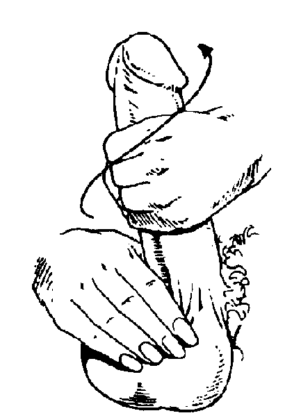 Эта поза хороша для стимулирования пениса с использованием смазки, на она не подходит для мастурбации всухую. Хуже того, она держит пенис неправильно (ее пальцы находятся на уздечке), а его пенис кажется искусственно приставленным к телу. жете также делать это прямо оттуда, где сидите, если только это место не находится на другом конце комнаты. Я думаю, что вы сидите близко, потому что вы только что наносили смазку на его гениталии. Различные виды движений, используемые при массаже Те движения, которые описываются ниже, представляют собой не что иное, как возможные варианты. Возможно, вы захотите опробовать один или два из них на практике. Изменение темпа вперемежку с различными видами движений может внести в занятия сексом приятное разнообразие. Вы, конечно, можете сначала потренироваться на банане, однако большая часть мужчин с удовольствием согласится подвергнуться такому испытанию. К тому же в этом случае совсем не обязательно иметь эрекцию, чтобы чувствовать себя на седьмом небе от счастья. Многие мужчины во время массажа пениса испытывают состояние полуэрекции. Некоторые мужчины считают, что самые сильные ощущения от массажа можно испытывать в том случае, если эрекция пениса составляет примерно 60—75 процентов.